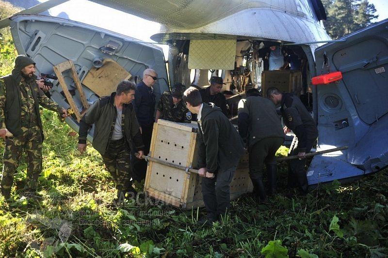 Утром хищников посадили в специальные деревянные клетки и на вертолете доставили на склон горы Ятыгварта, сообщили в пресс-службе заповедника.