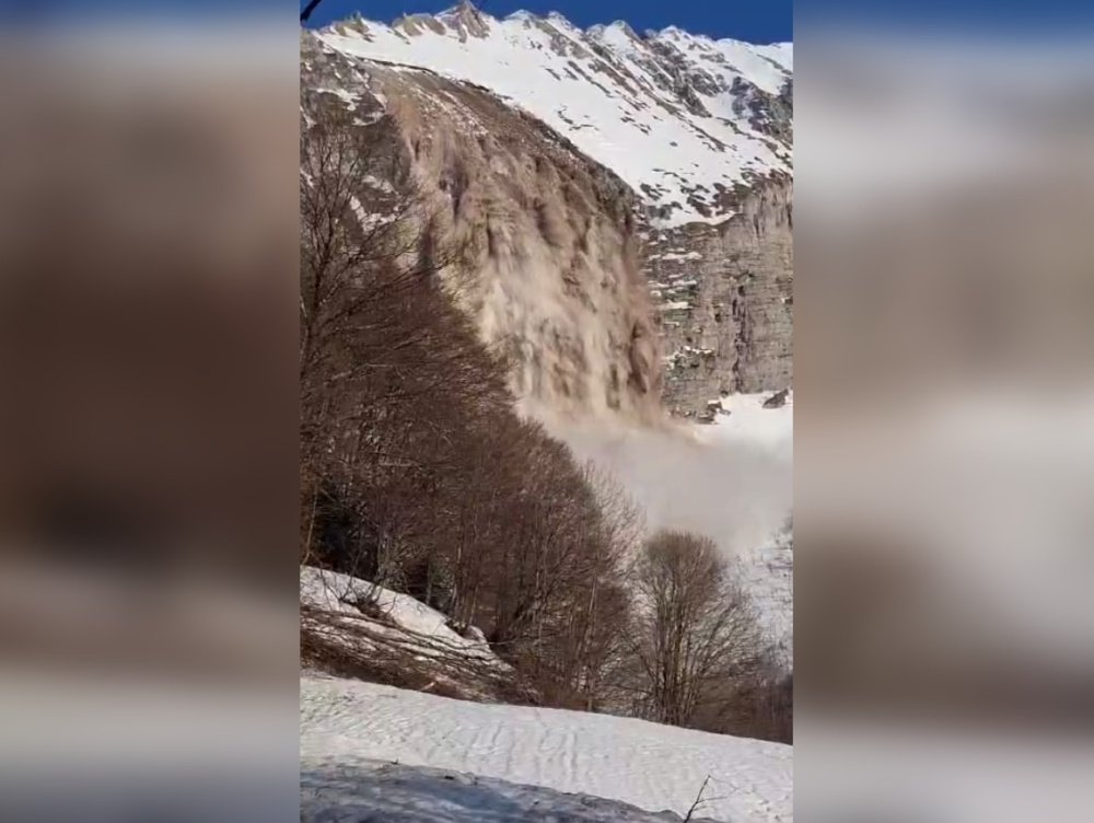 В горах Сочи удалось снять сход мощнейшей лавины. Снежная масса, смешанная с камнями и грунтом, обвалилась будто водопад в районе горного массива Фишт. Ее объем составил более тысячи кубометров.