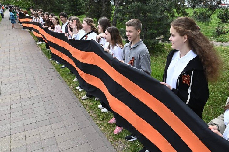 Георгиевскую ленту длиной 1418 метров развернули в День Победы в Краснодаре