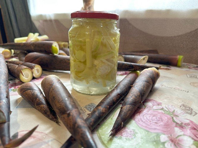 Обычно стебель режут кольцами, промывают и отваривают в кипящей воде. Только после этого его можно засолить в маринаде или закатать на зиму. Нередко бамбук тушат с луком, овощами и миксом из кавказских трав.