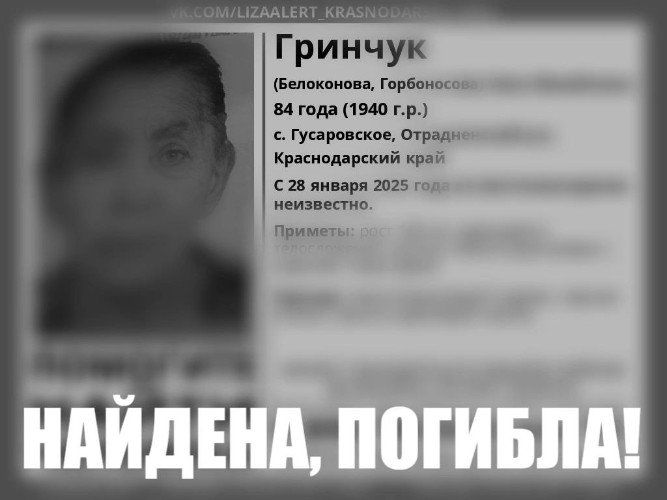 84-летнюю Нину Гринчук искали семь недель. Женщина не вернулась домой в селе Гусаровское Отрадненского района 28 января. С того дня ее семья не находила себе места, о местонахождении бабушки ничего не было известно.